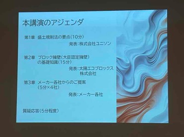 ![]() 第3章では、各社が取り扱う型枠ブロック4機種について具体的な比較・紹介が行われました。 | ![]() 第一章では、盛土規制法の概要について、ユニソン 石垣氏より解説。 |