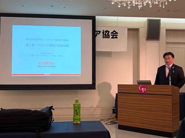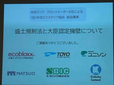 | これを受け、中京エリアを商圏とするブロックメーカー6社が合同で登壇し、盛土規制法の概要説明に加え、関連する型枠ブロック製品についての紹介が行われました。 下記の6社が一堂に会するという、業界的にも非常に貴重な機会となり、実務者同士の連携の強さと課題意識の共有が感じられる場面となりました。 ・久保田セメント工業 ・太陽エコブロックス ・東洋工業 ・マツオコーポレーション ・ユニソン ・エスビック | ![]() |